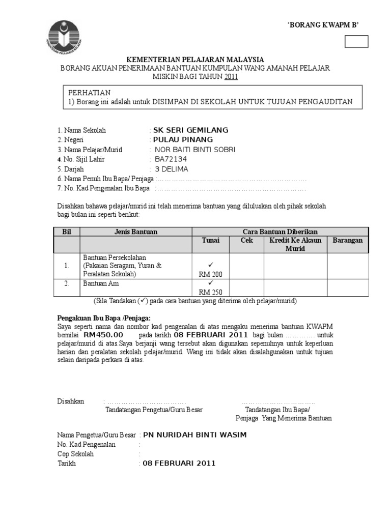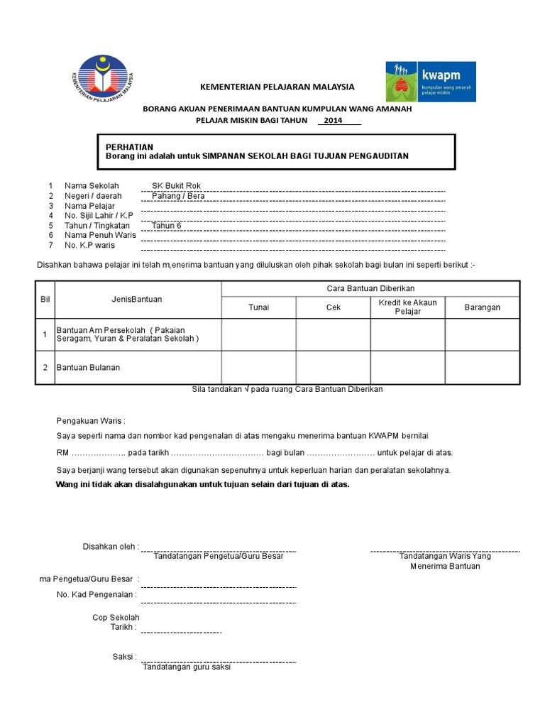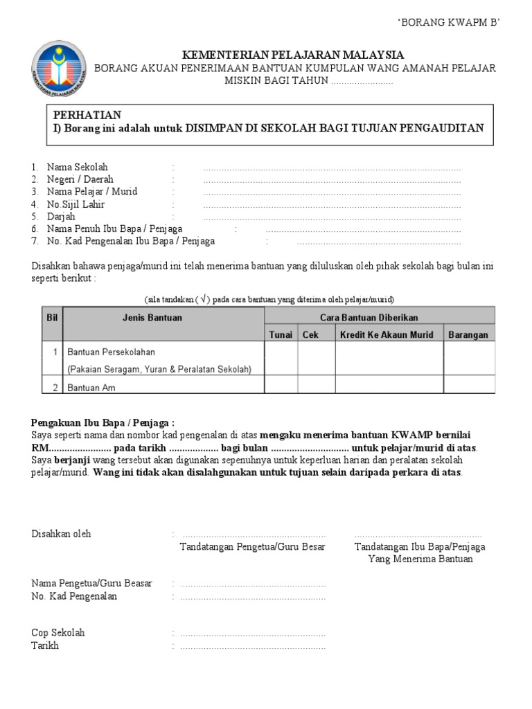 Borang permohonan bantuan duit kwapm klik muat turun. 2Sukacitanya dimaklumkan saya _____ dengan ini menerima pelantikan jawatan sebagai _____ tahun 2015 bagi mata _____3Saya berjanji akan memberi kerjasama dan komitmen yang sepenuhnya dalam menjalankan tanggungjawab yang diamanahkan kepada. Berikut dikepilkan borang akuan penerimaan dan pengesahan kemasukan wang kwapm ke dalam akaun sekolah.