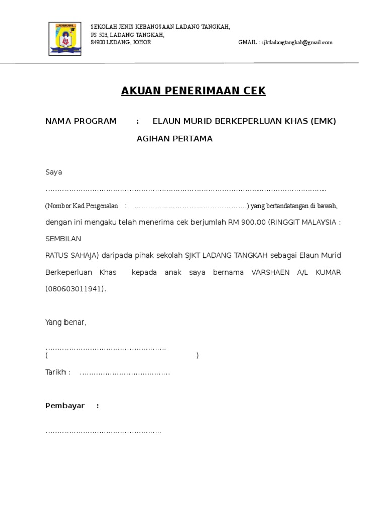 The collection that consisting of chosen picture and the best among others. Contoh Surat Akuan Penerimaan - Ahu-0241750102014 tanggal 10 juni 2014 npwp an. PERAKUAN PENERIMAAN WANG Saya bernombor kad pengenalan telah menerima bayaran sebanyak RM pada tarikh bagi tujuan dan telah disaksikan oleh selaku Yang Benar Penerima Nama.