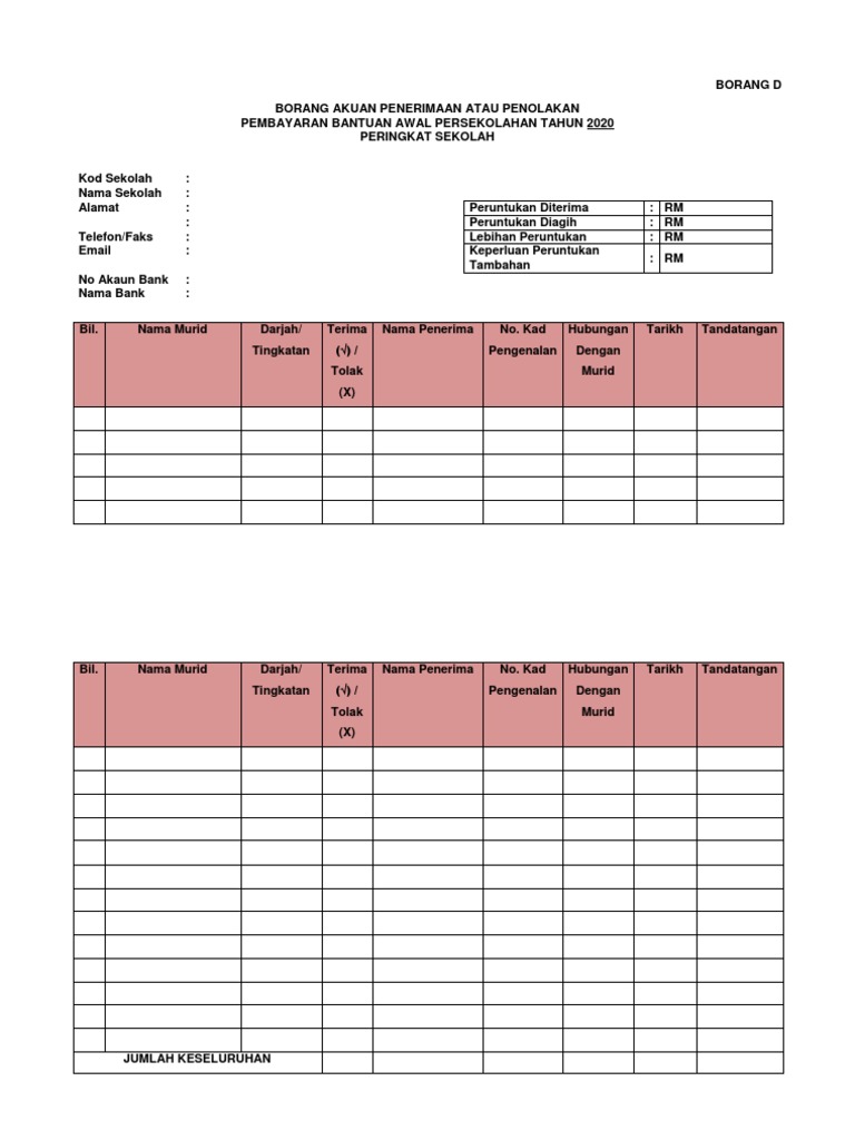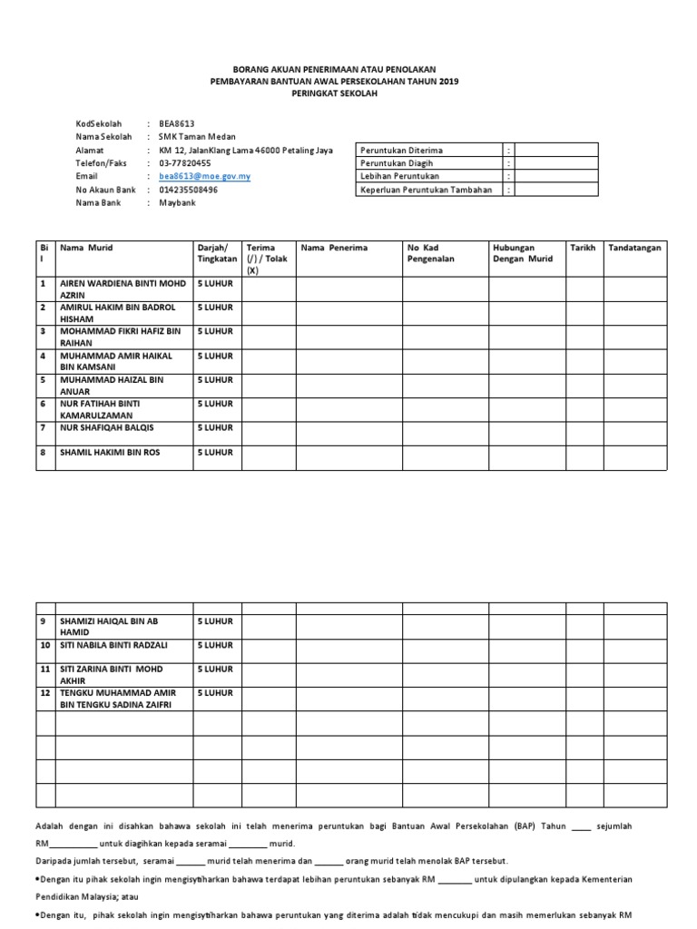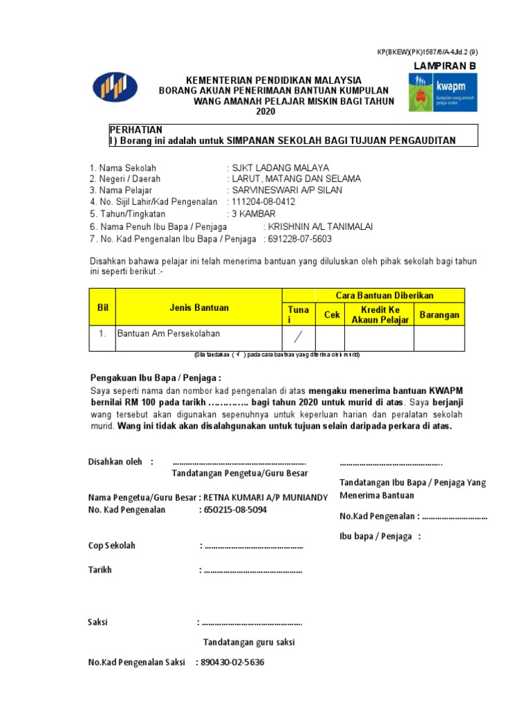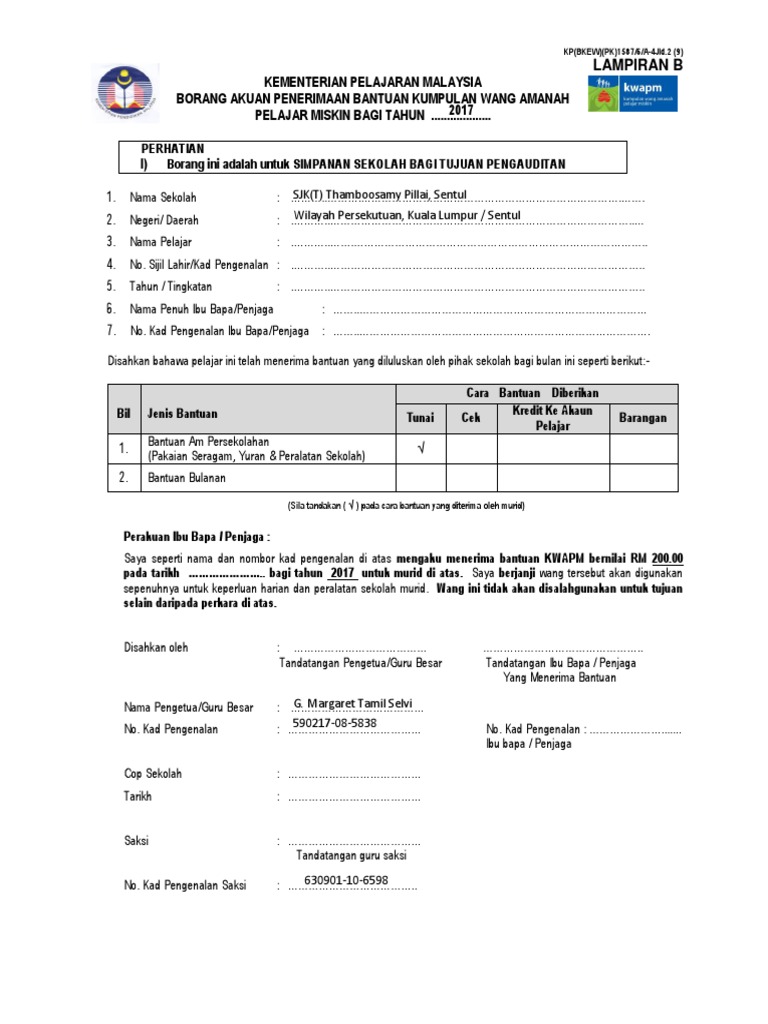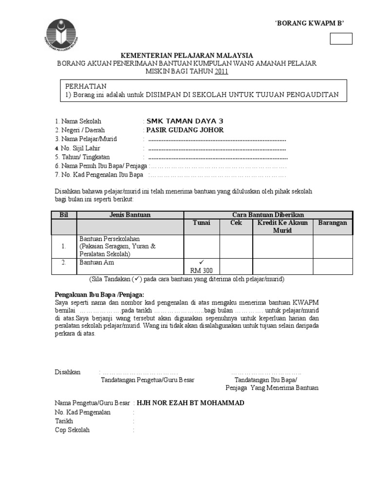 _____ kementerian pelajaran malaysia borang akuan penerimaan bantuan kumpulan wang amanah miskin sekolah menengah bagi tahun 2016 perhatian 1 borang ini adalah untuk disimpan di sekolah bagi tujuan pengauditan. Negeri daerah segamat johor 3. Diperbuat dan dengan sesungguhnya diakui oleh.
